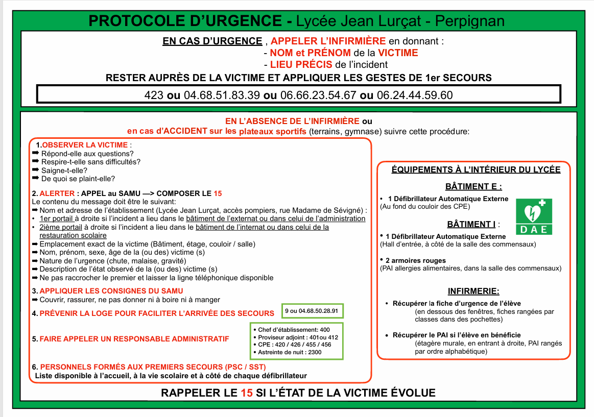 Ouverture de l'infirmerie du lycée pendant le temps de présence des élèves et de démarrage de l'internat en soirée.